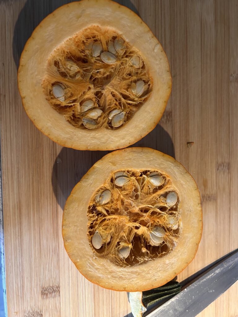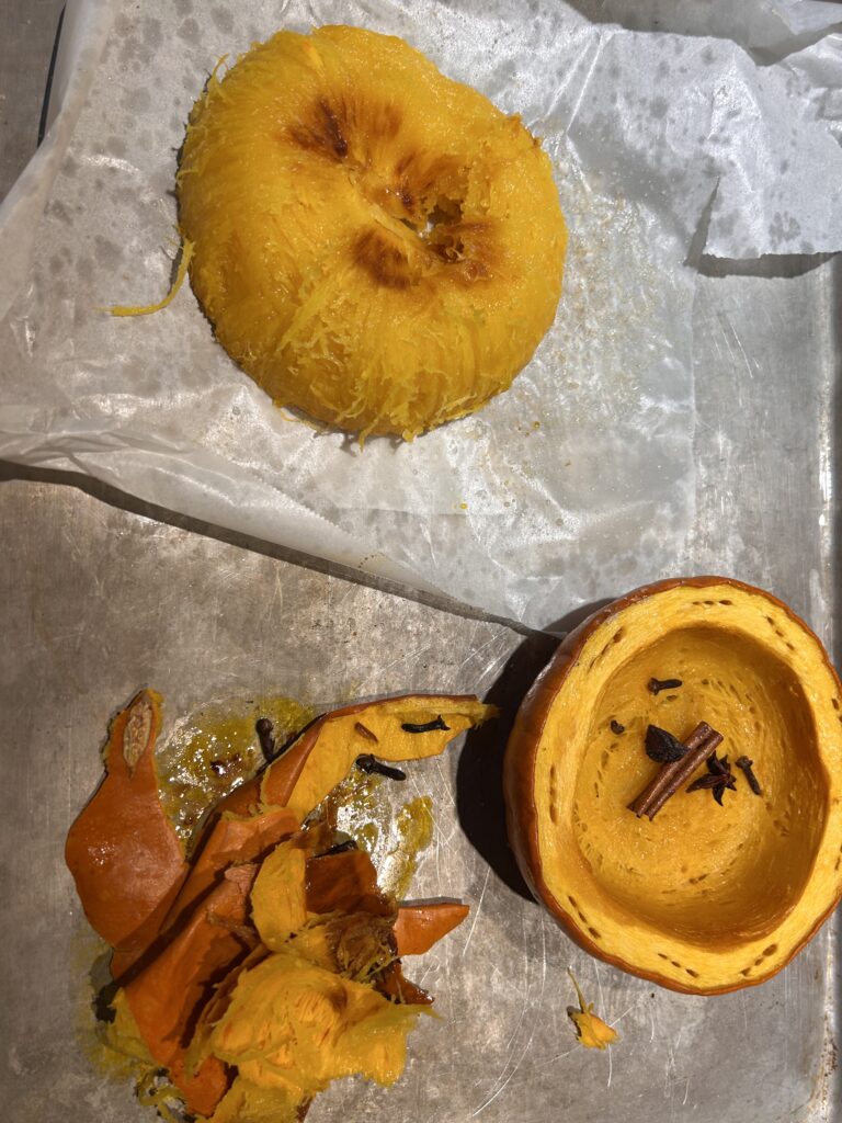 - 1 smol (small) sugar pumpkin + whole cinnamon, nutmeg, cloves, coconut oil