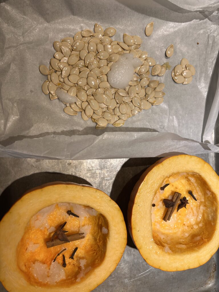Chop your pumpkin in half. Scrape out the seeds and clean them well under running water. Place them on a cookie sheet and rub them with oil. Bake alongside your pumpkin halves. Prick your pumpkin with a fork. Smoosh in some coconut oil, and put a half a cinnamon stick, a few cloves, and a scratch of nutmeg. Bake uncovered at 350 for 45 minutes to an hour. In the last 20 minutes, sprinkle some granulated sugar and pumpkin pie spice onto your seeds. Once your pumpkin is soft, remove from oven, and set aside.