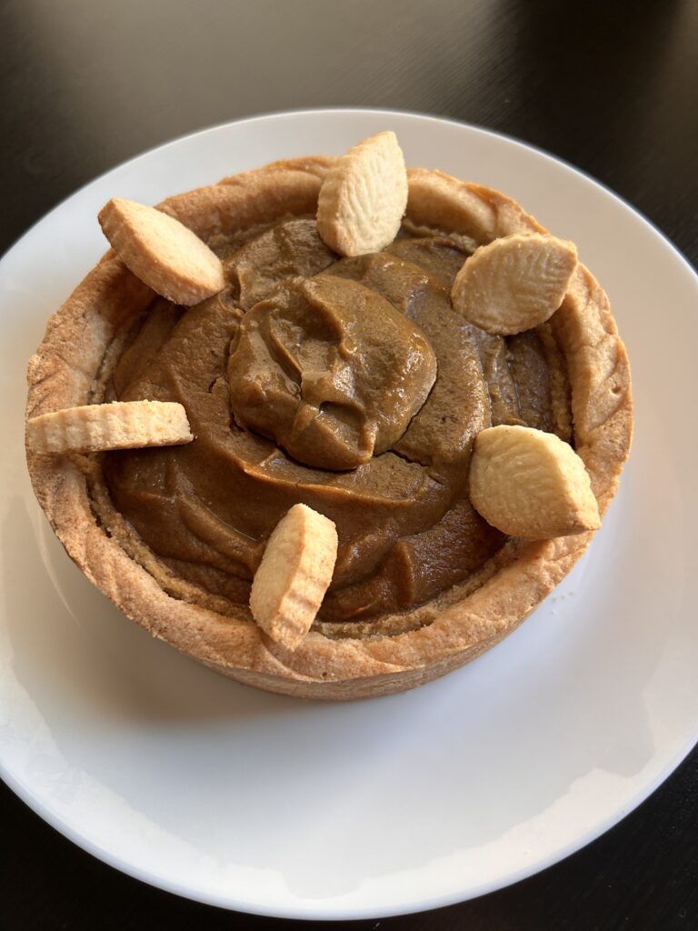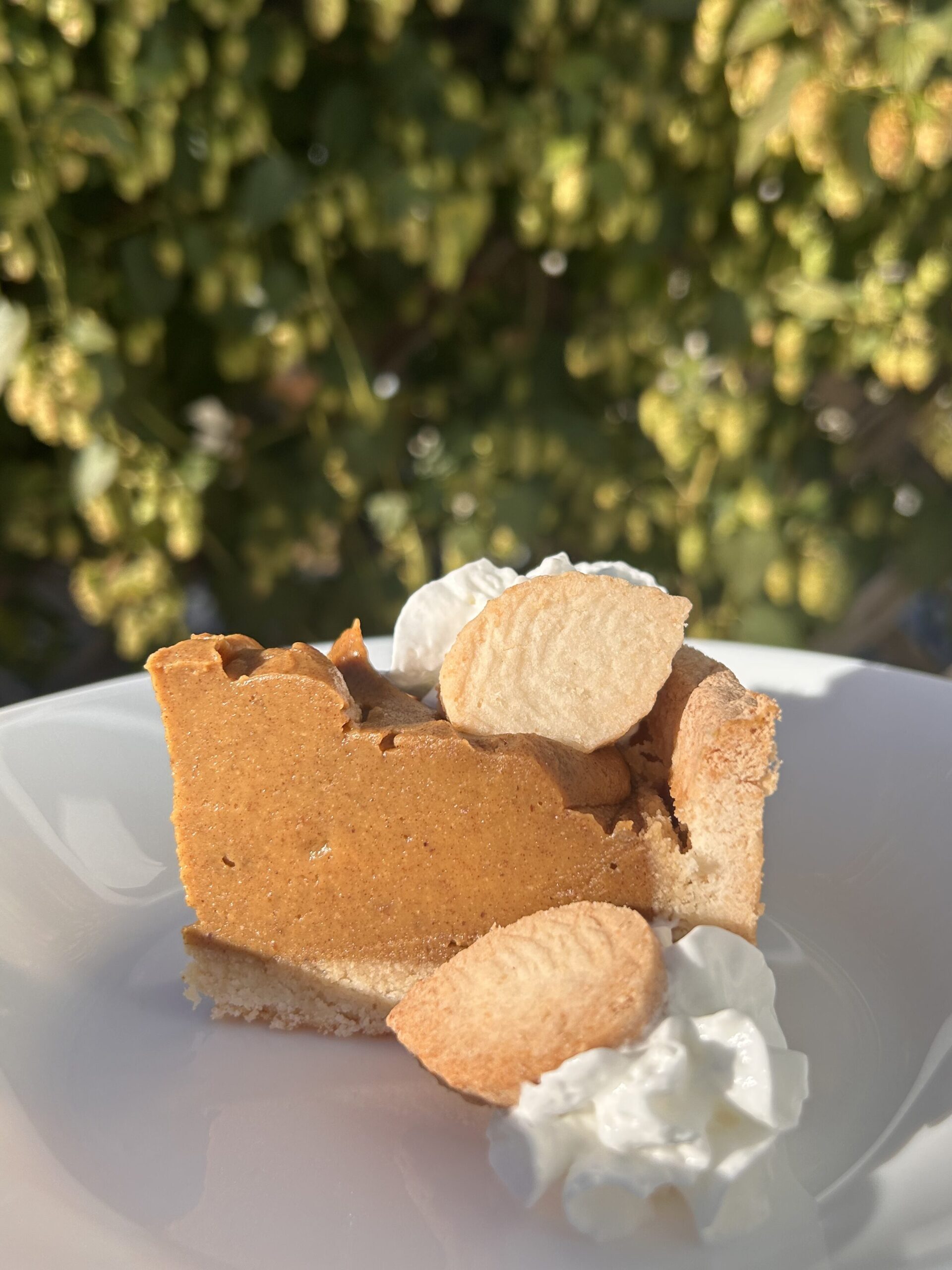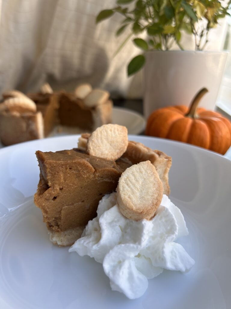 To serve, slice up your pie, top with whipping cream if desired (I used coconut cream for myself and whip for my family) and then top with cookies and candied pumpkin seeds. We ate all the seeds on Thanksgiving and I forgot to snap a pic but you can imagine it was delicious I am sure π